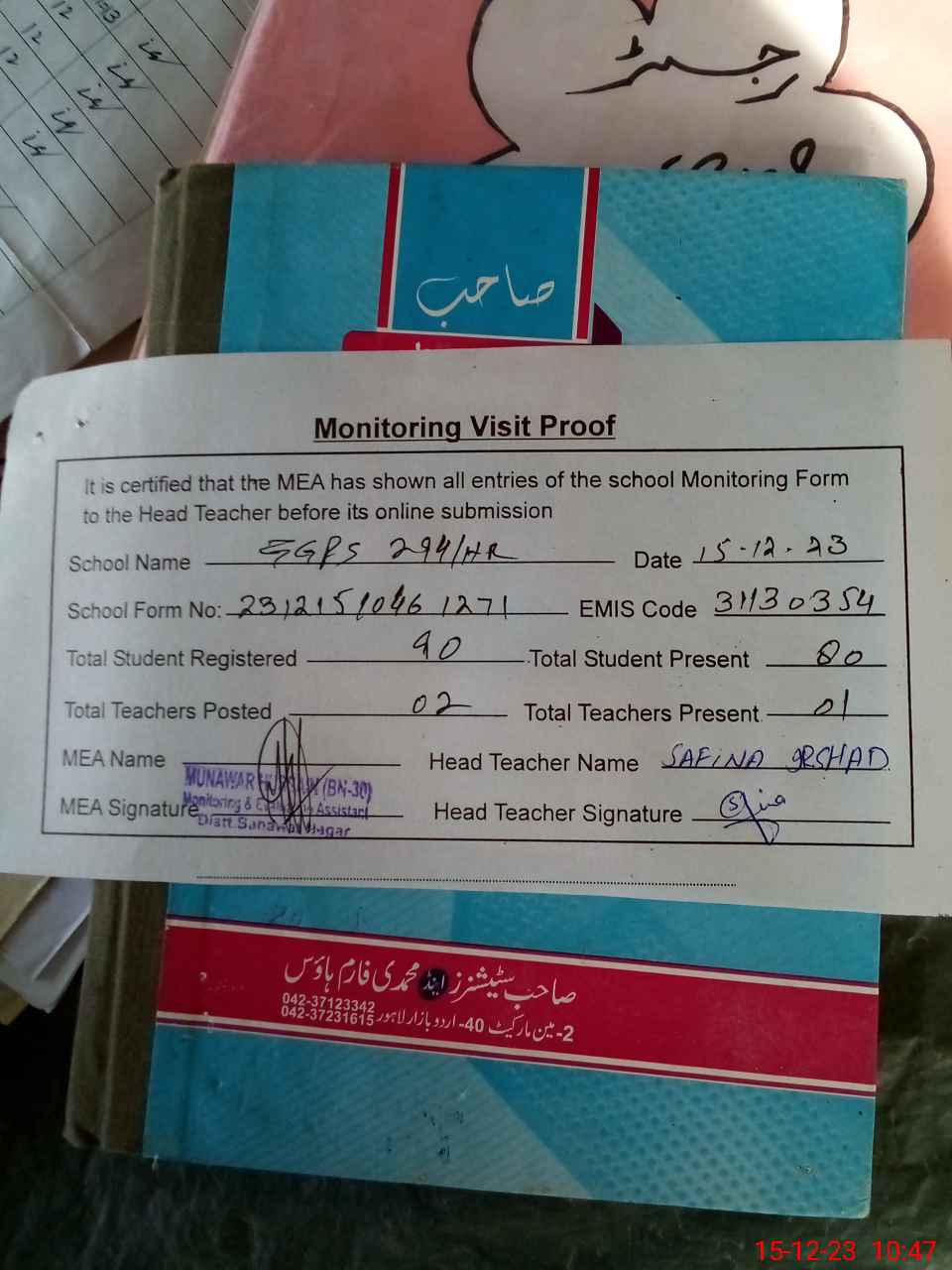 | Attendance Register | Head Teacher | MEA with School | Visit Proof |