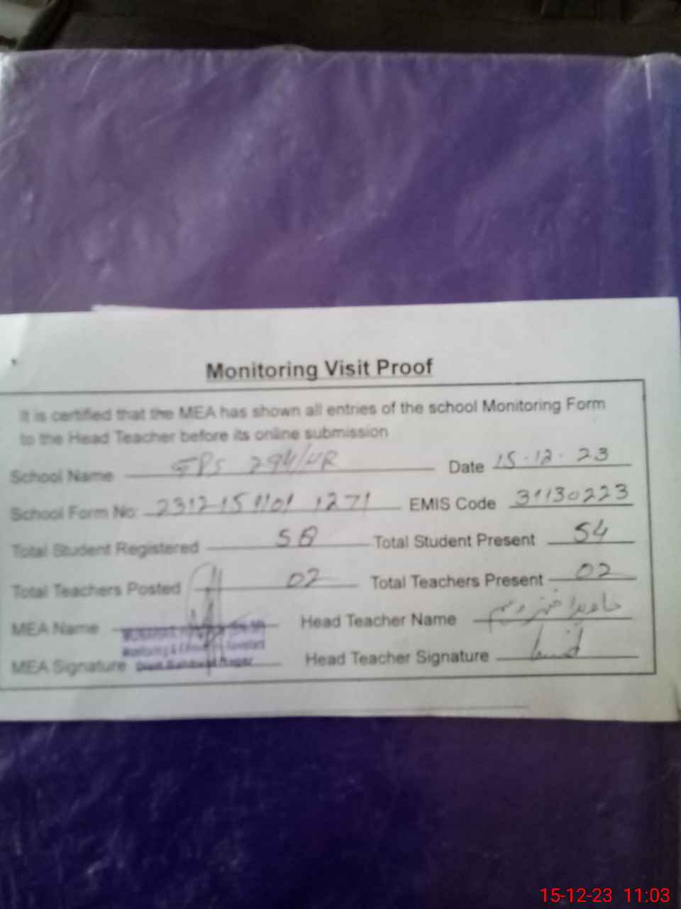 | Attendance Register | Head Teacher | MEA with School | Visit Proof |