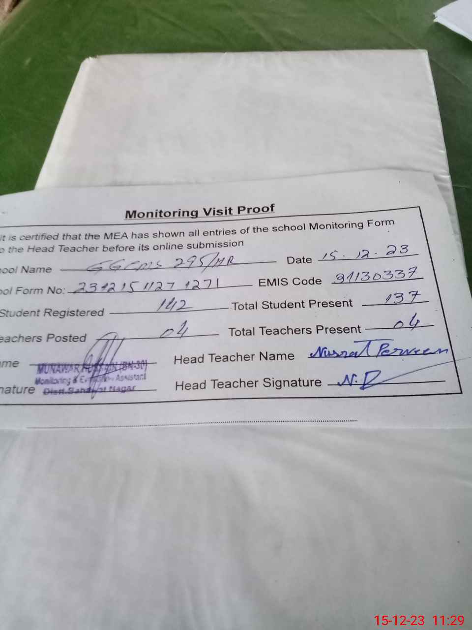 | EMIS Code: 31130337 | Name of School: GGCMS CHAK NO. 295 HR | |||