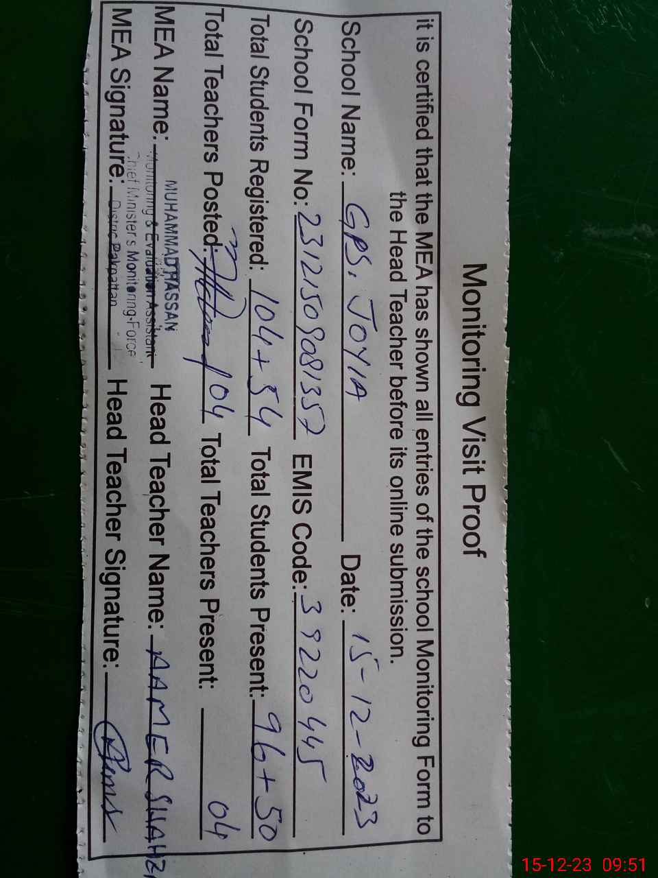 | Attendance Register | Head Teacher | MEA with School | Visit Proof |