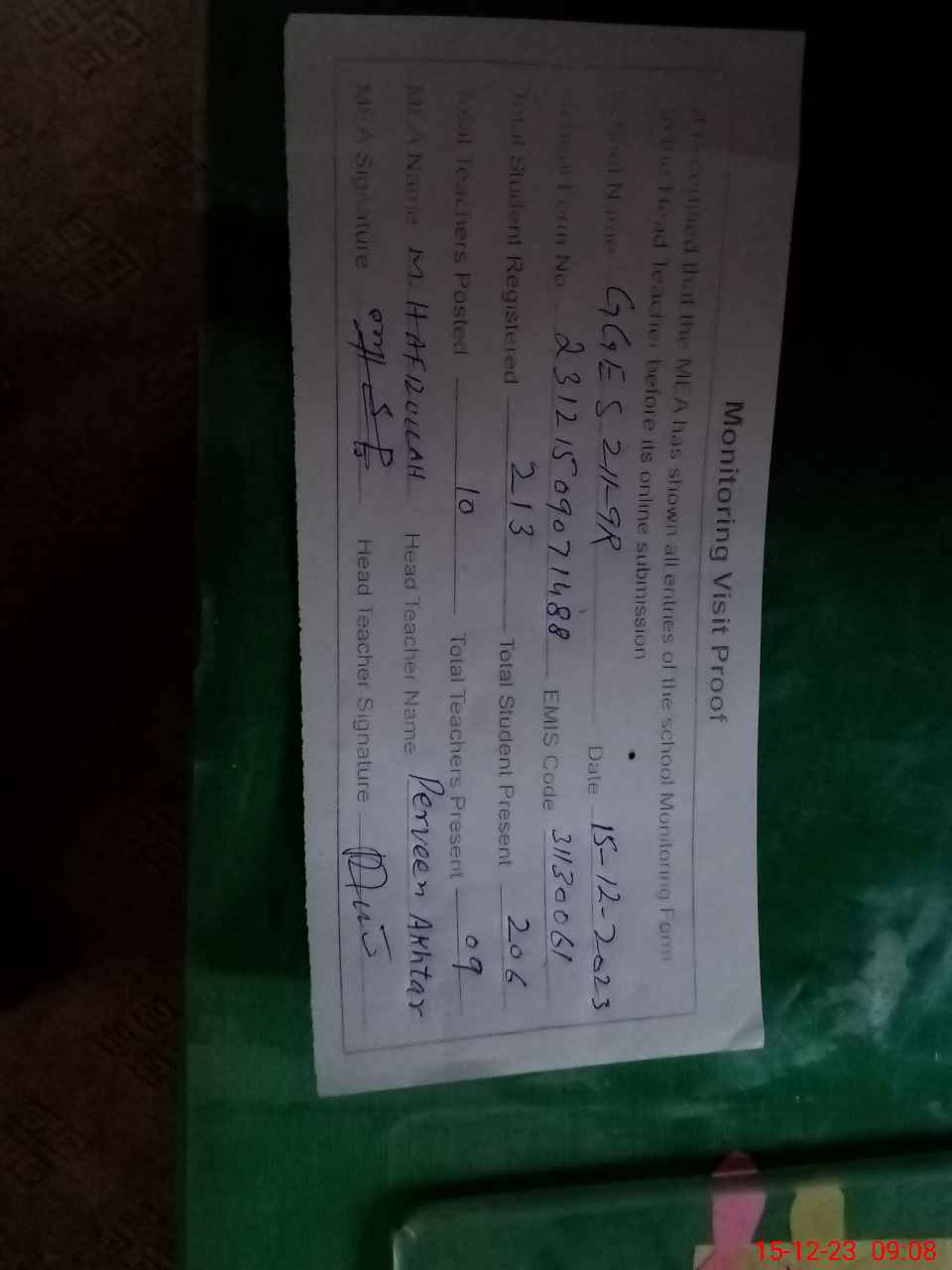 | Attendance Register | Head Teacher | MEA with School | Visit Proof |