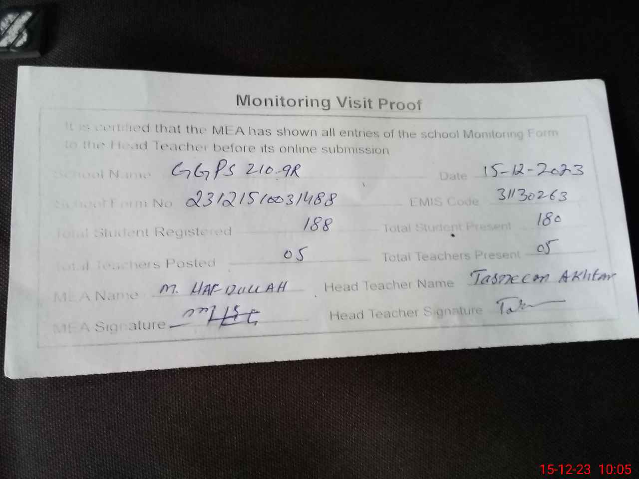 | Attendance Register | Head Teacher | MEA with School | Visit Proof |