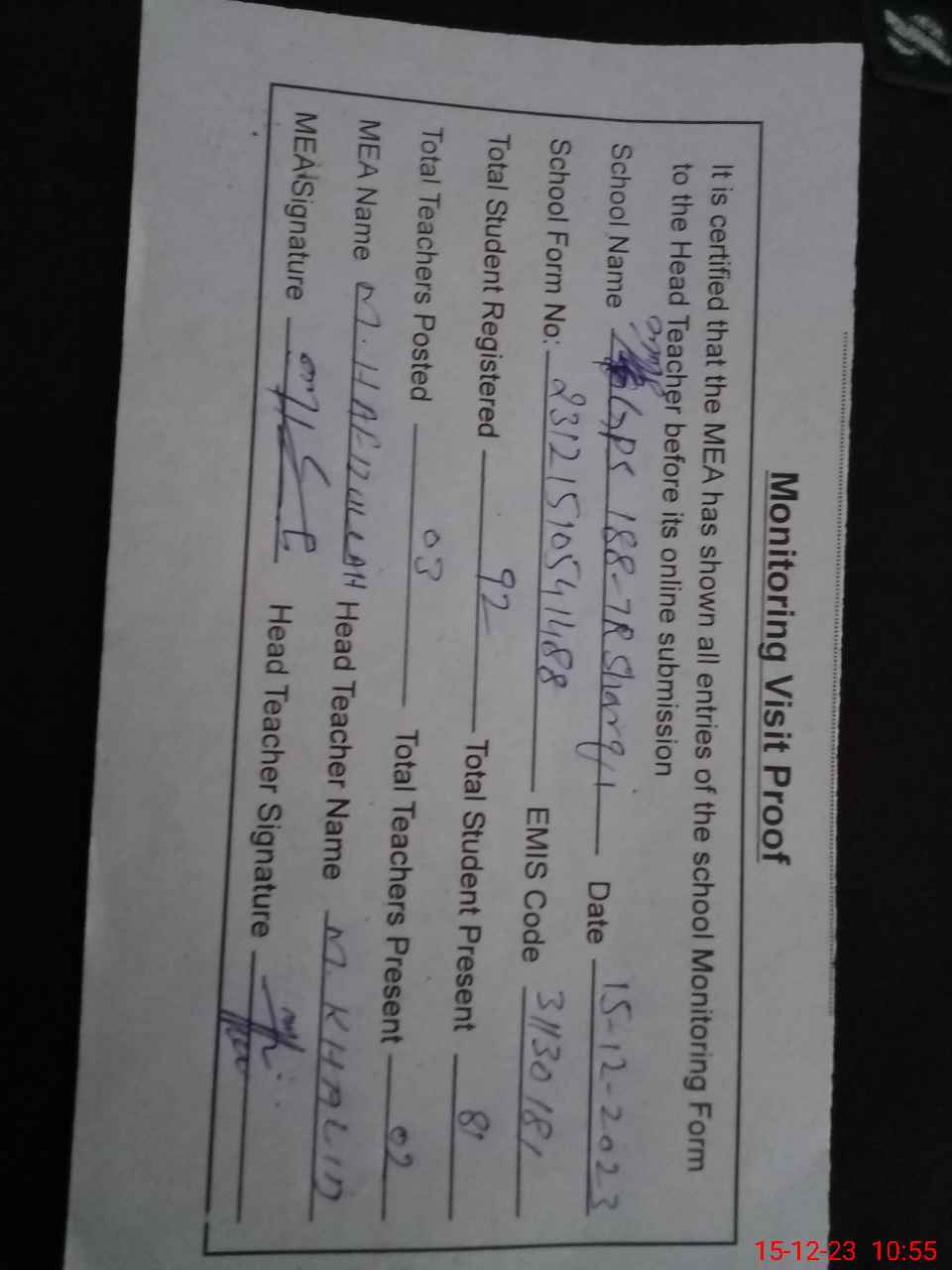 | Attendance Register | Head Teacher | MEA with School | Visit Proof |