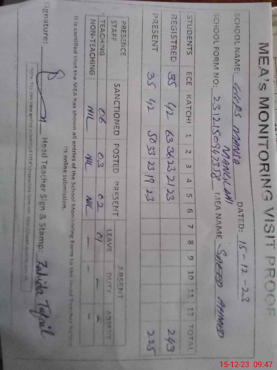| Attendance Register | Head Teacher | MEA with School | Visit Proof |