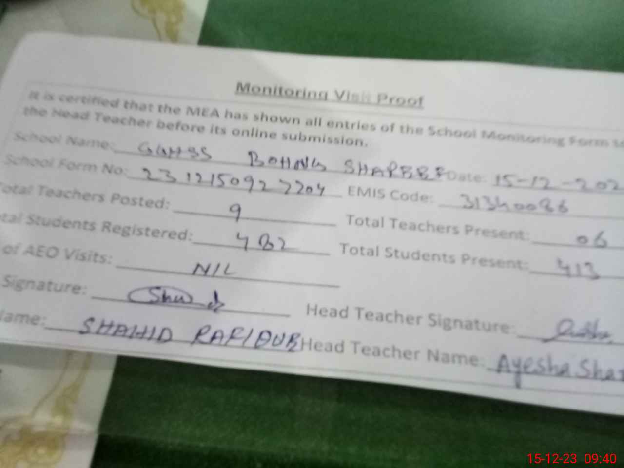 | EMIS Code: 31340086 | Name of School: GGHSS BHONG SHARIF | |||