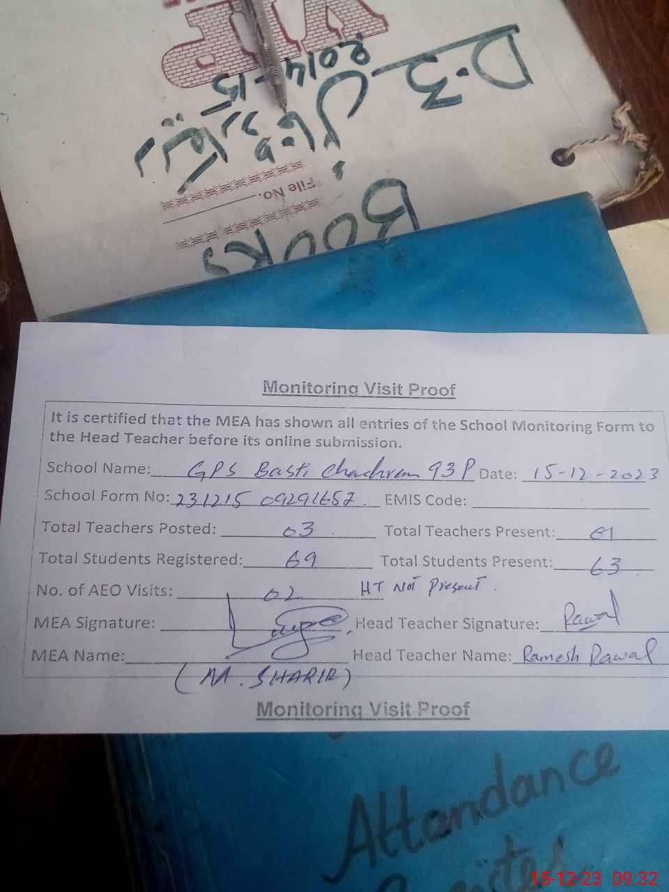 | Attendance Register | Head Teacher | MEA with School | Visit Proof |