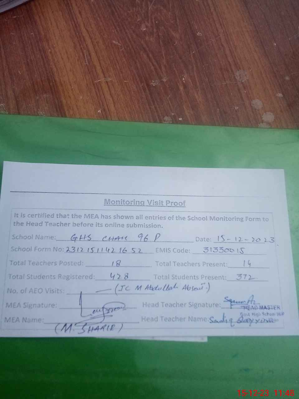 | EMIS Code: 31330015 | Name of School: GHS CHAK 96/P | |||
