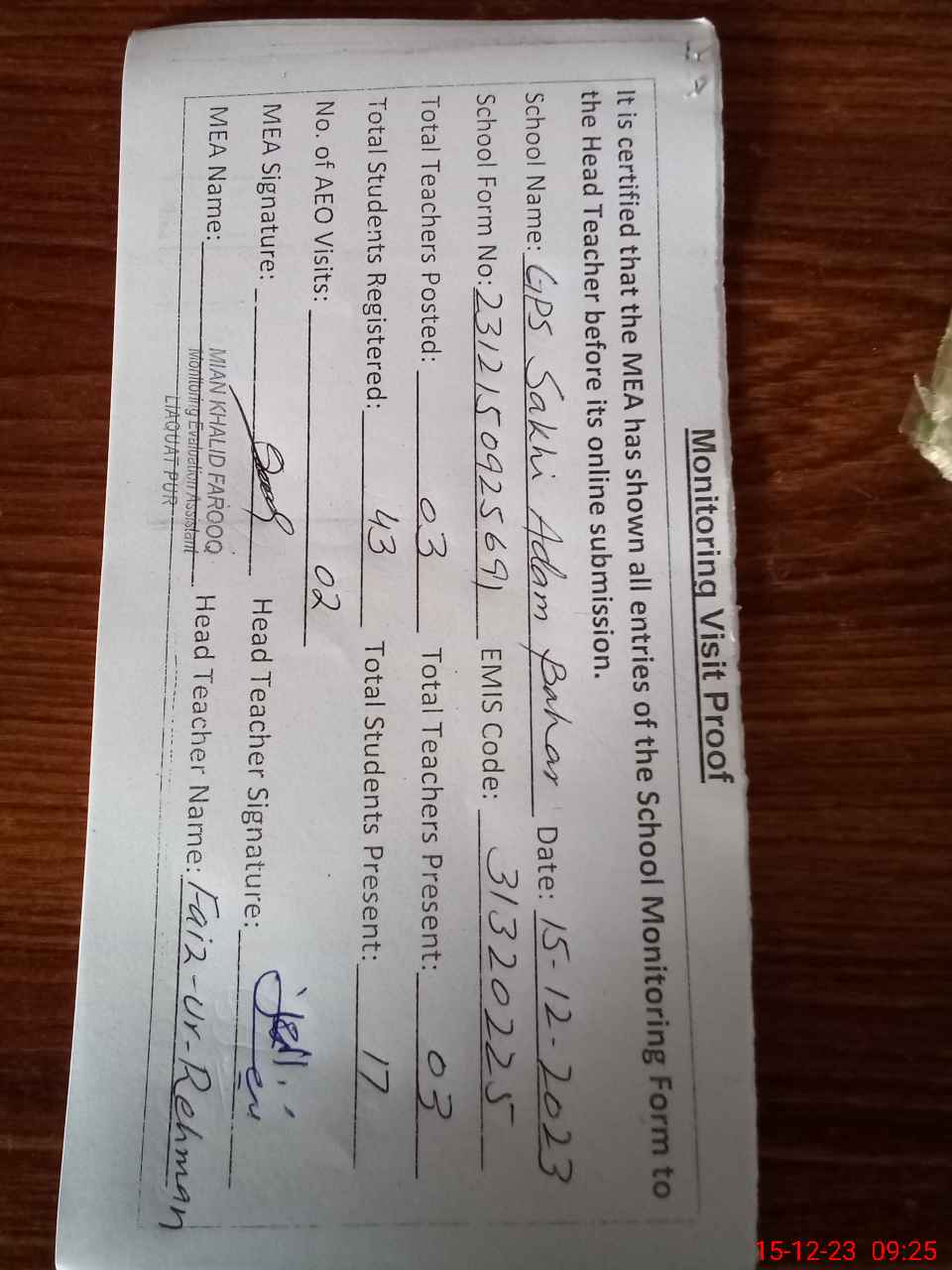 | EMIS Code: 31320225 | Name of School: GPS SAKHI ADAM BAHAR | |||