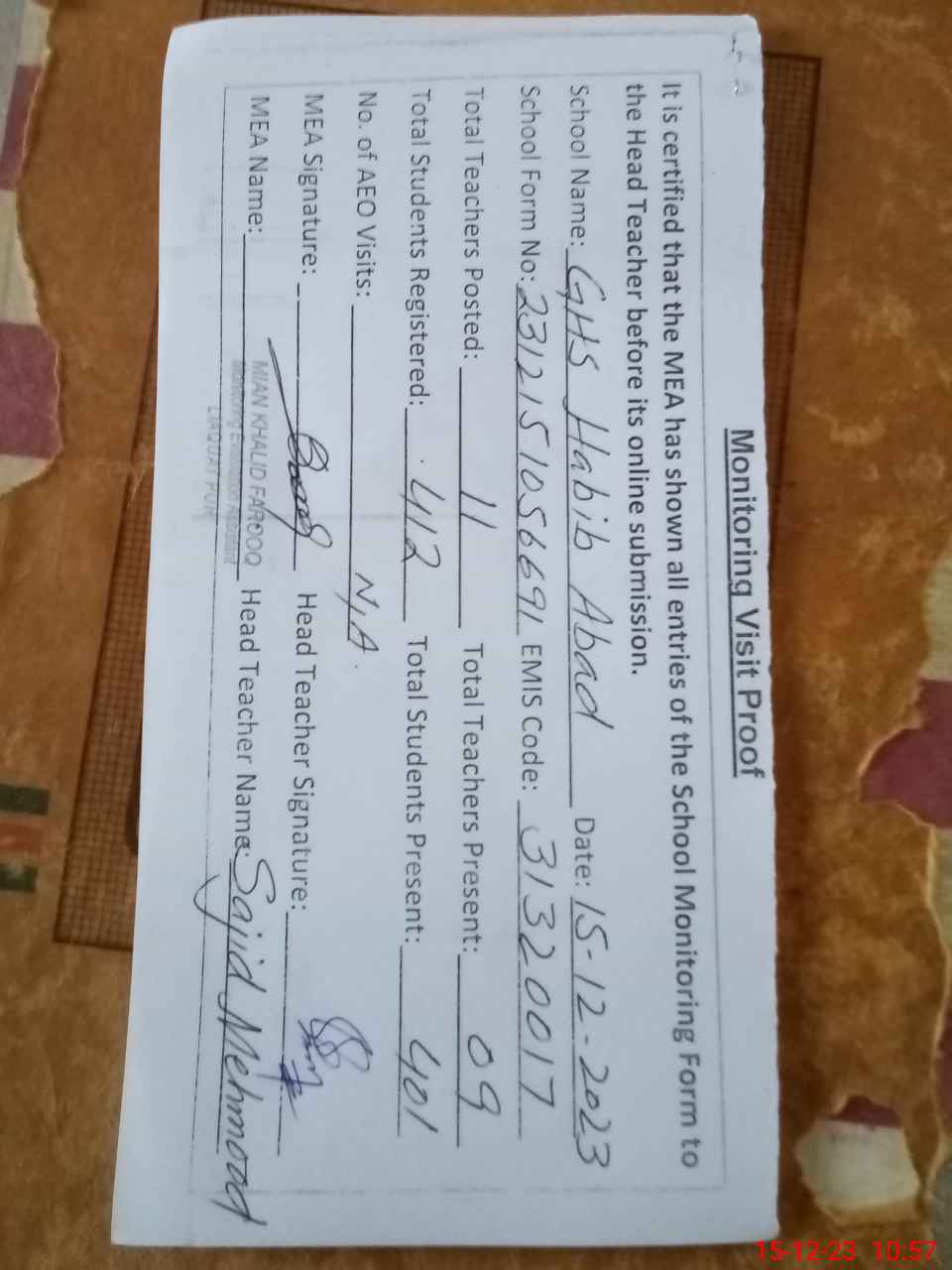 | EMIS Code: 31320017 | Name of School: GHS HABIB ABAD | |||