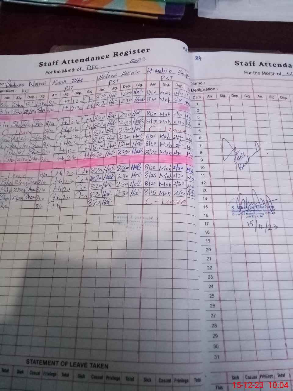 | CNIC | Full Name | Designation | R/C | Absence During Last Calender Month |