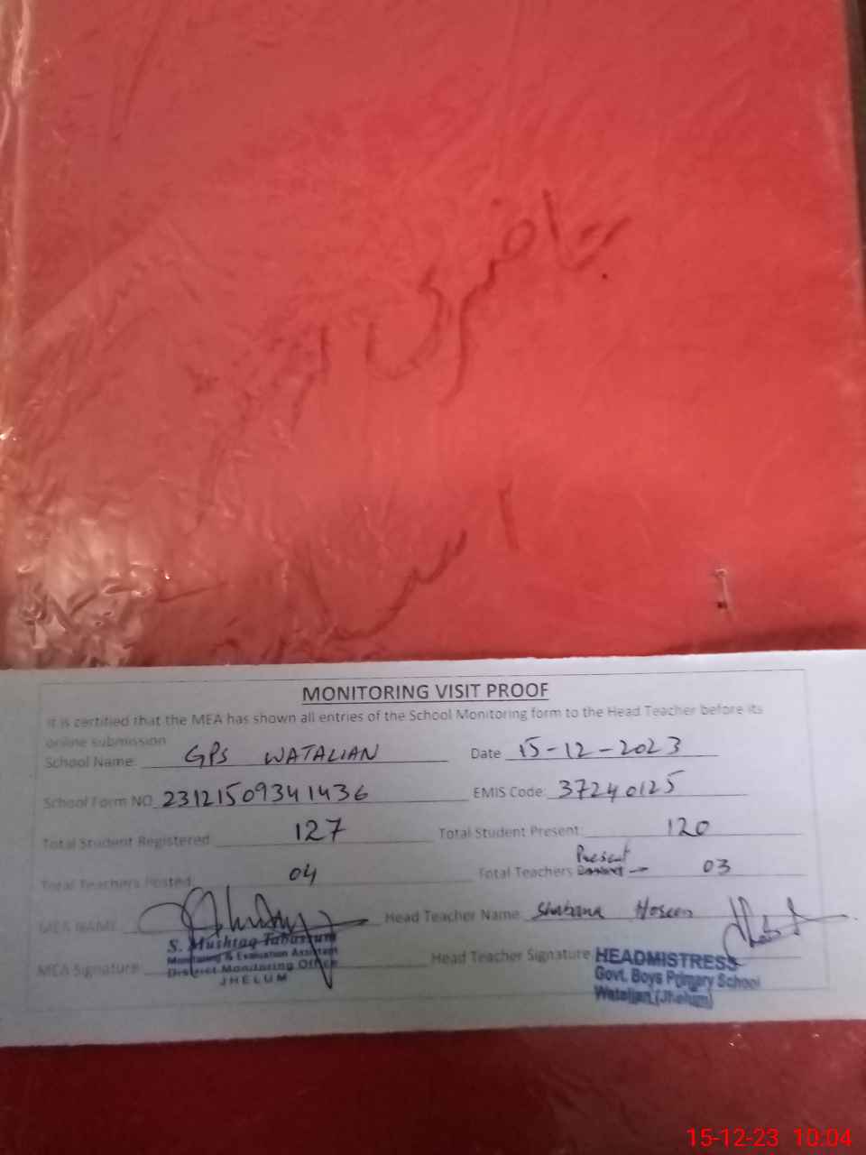 | Attendance Register | Head Teacher | MEA with School | Visit Proof |