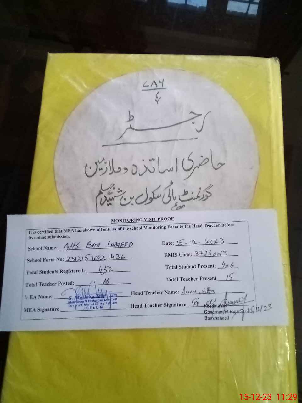 | Attendance Register | Head Teacher | MEA with School | Visit Proof |
