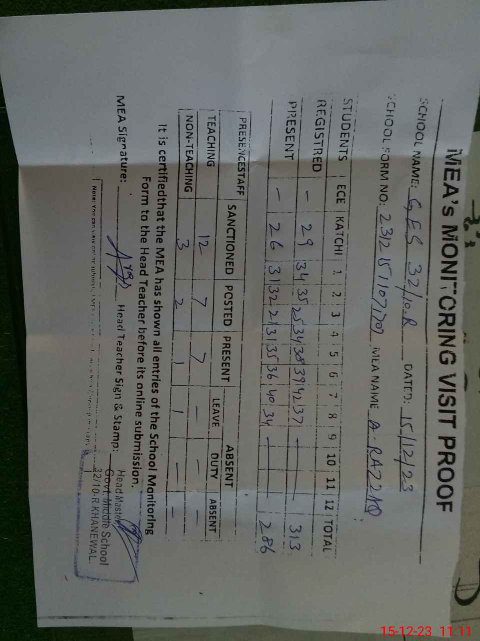 | Attendance Register | Head Teacher | MEA with School | Visit Proof |