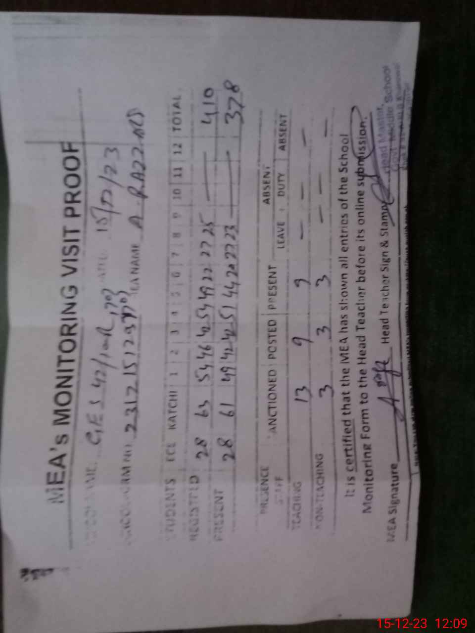 | Attendance Register | Head Teacher | MEA with School | Visit Proof |