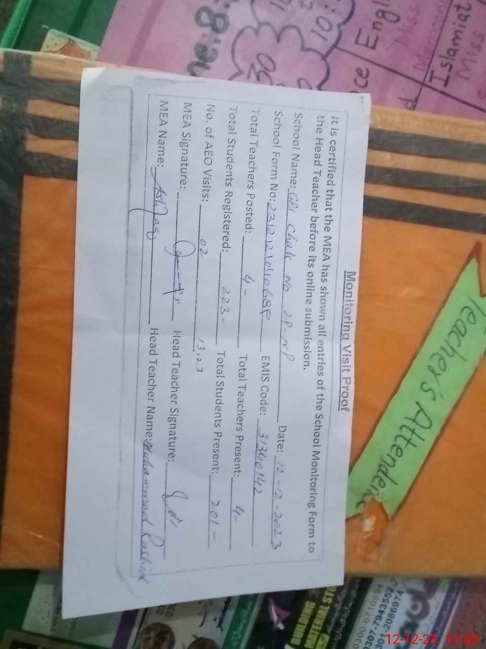 | Attendance Register | Head Teacher | MEA with School | Visit Proof |