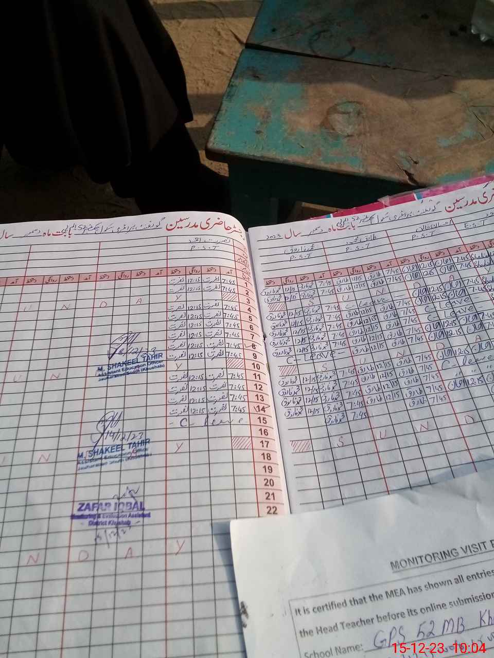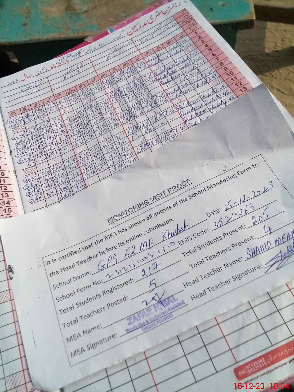 | Attendance Register | Head Teacher | MEA with School | Visit Proof |