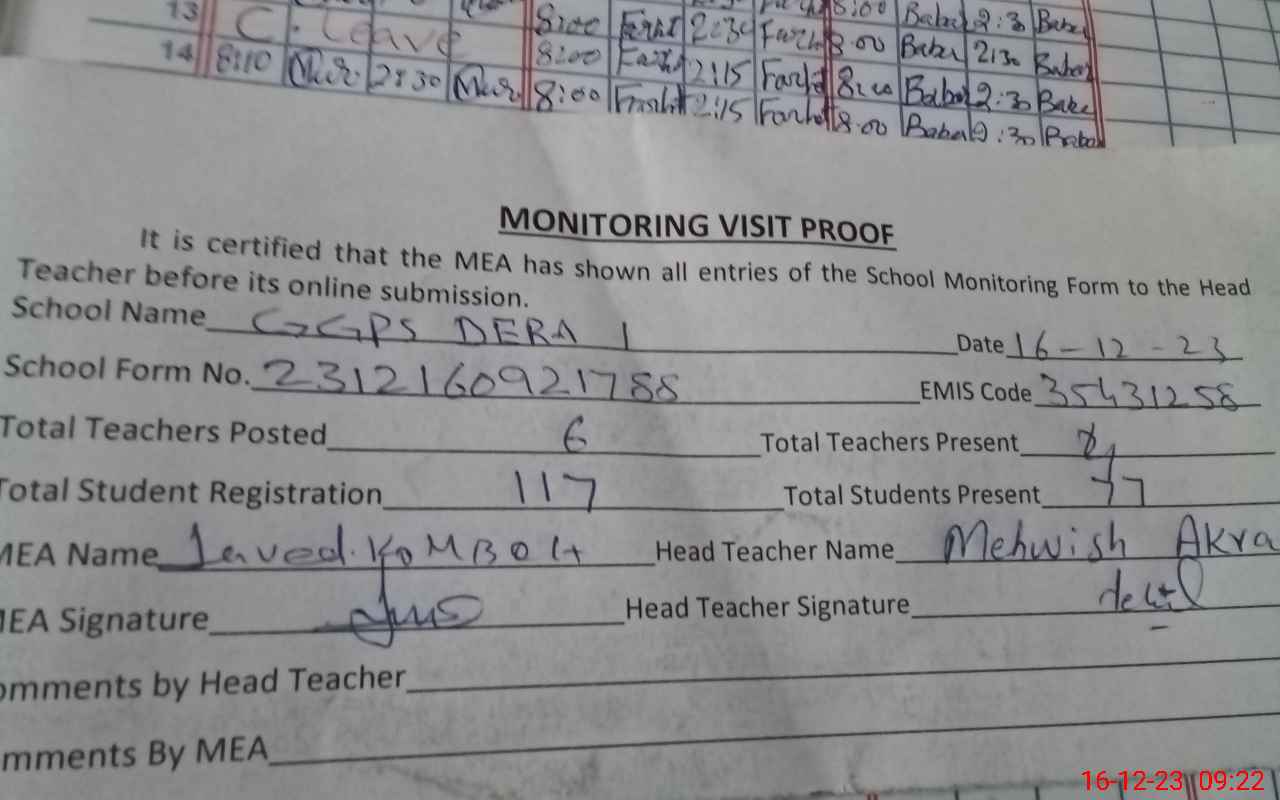 | Attendance Register | Head Teacher | MEA with School | Visit Proof |