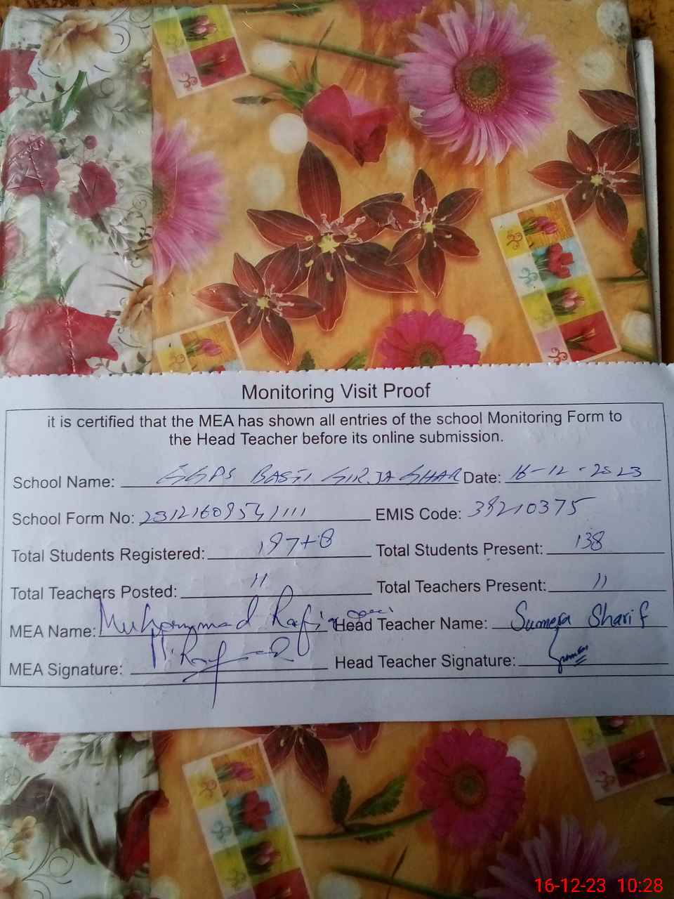 | Attendance Register | Head Teacher | MEA with School | Visit Proof |