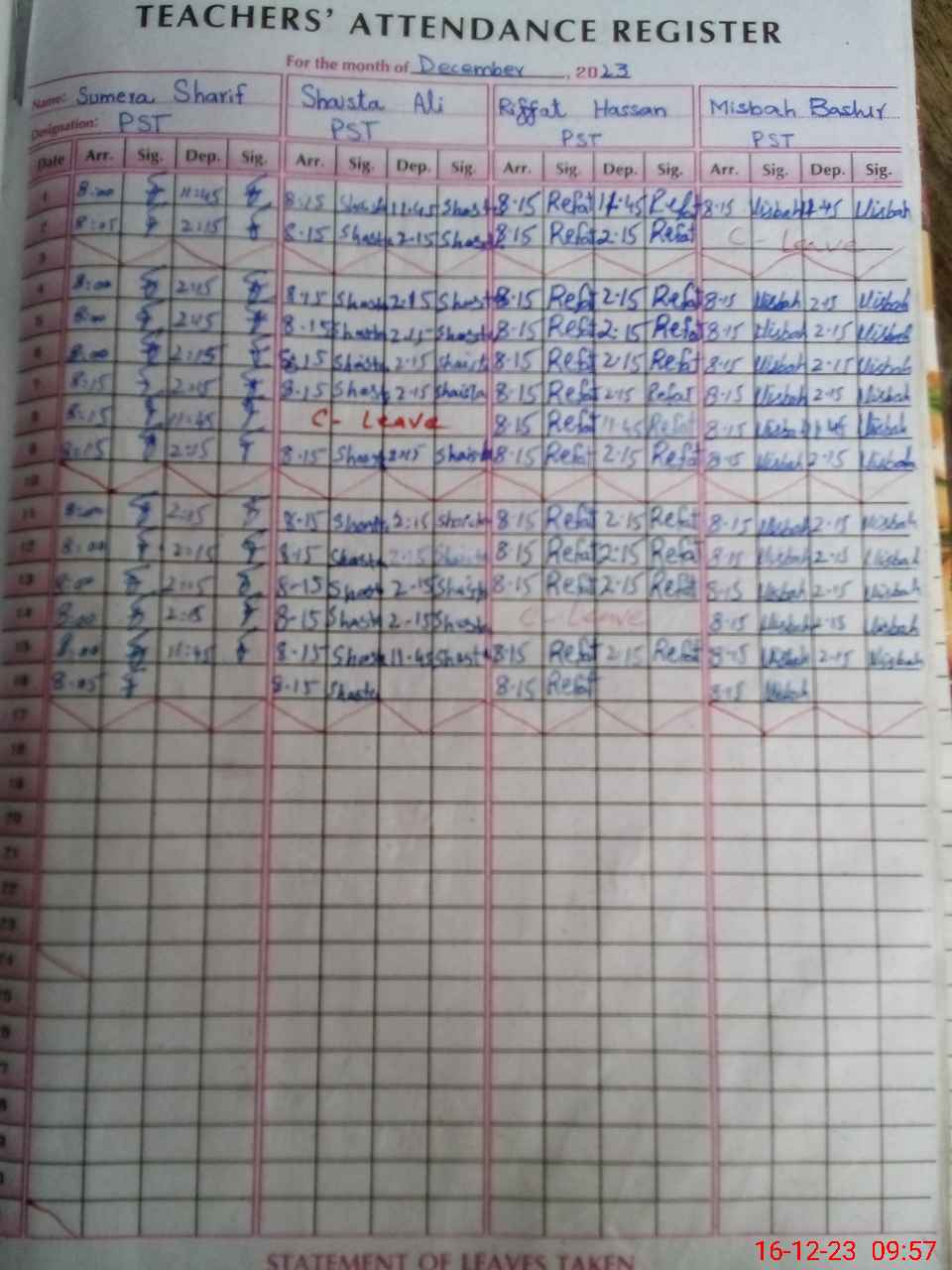 | CNIC | Full Name | Designation | R/C | Absence During Last Calender Month |