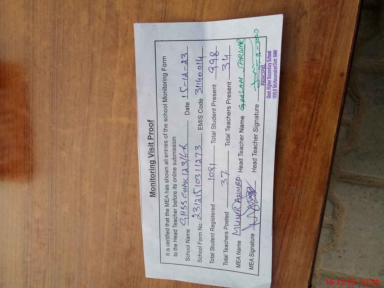 | Attendance Register | Head Teacher | MEA with School | Visit Proof |