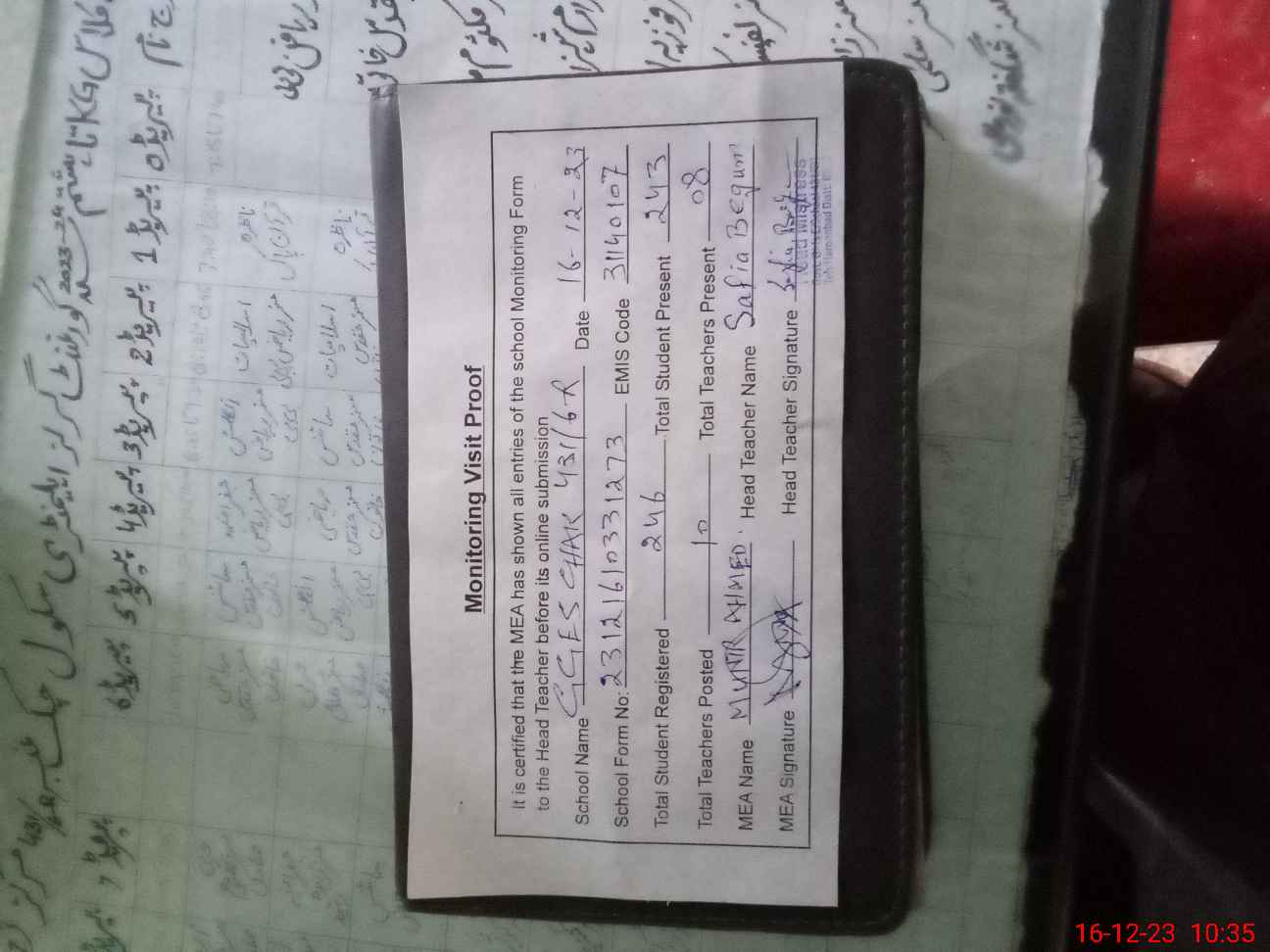 | Attendance Register | Head Teacher | MEA with School | Visit Proof |