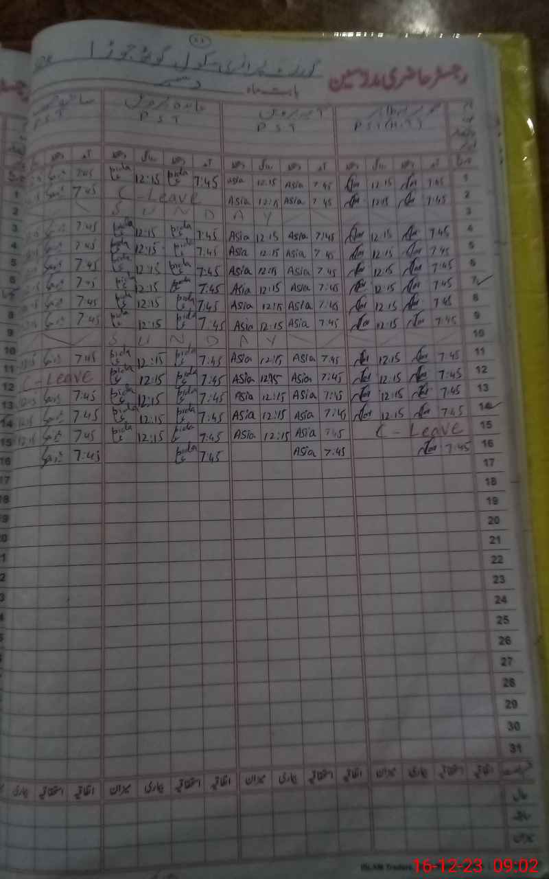| CNIC | Full Name | Designation | R/C | Absence During Last Calender Month |