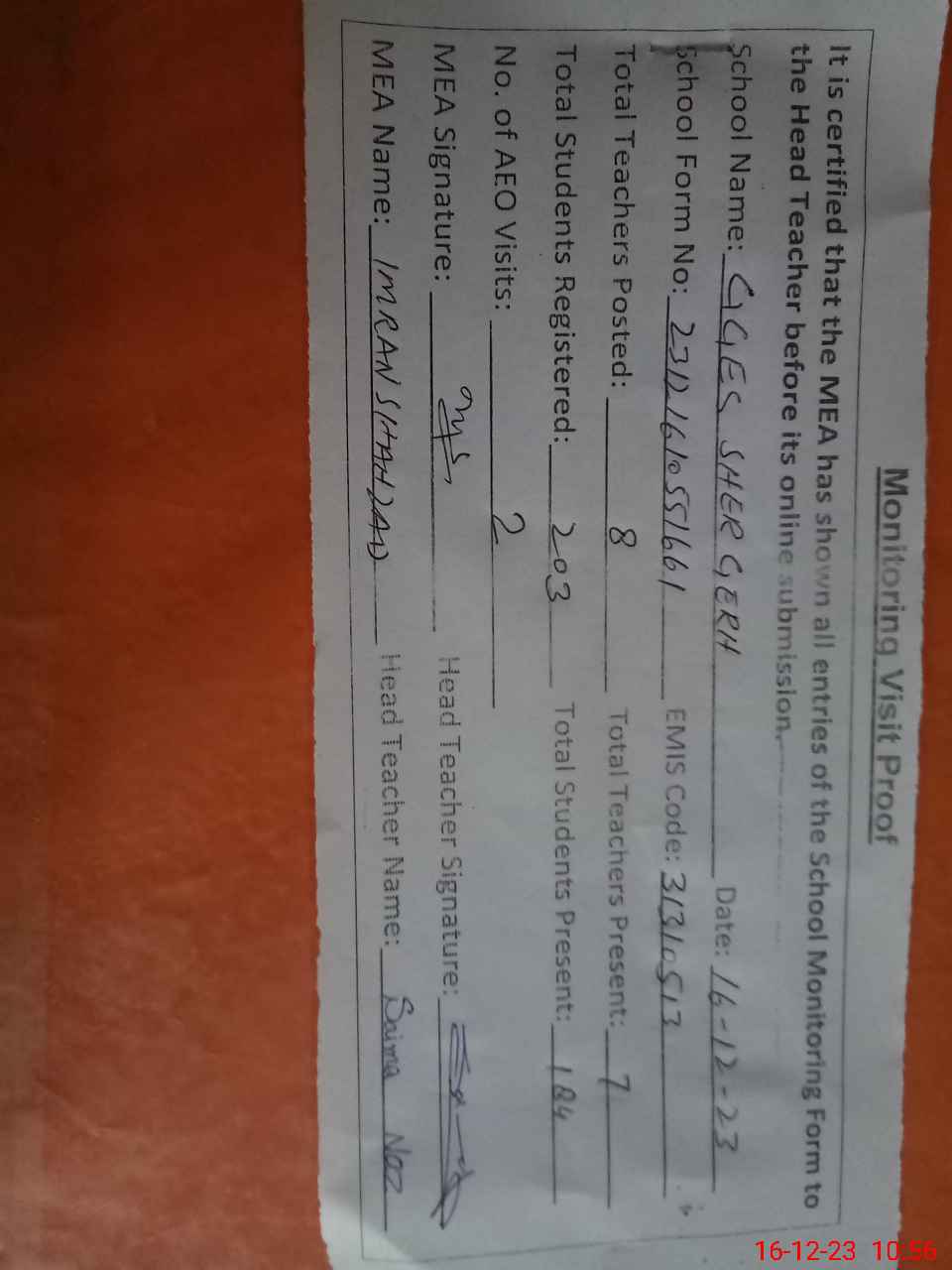 | Attendance Register | Head Teacher | MEA with School | Visit Proof |
