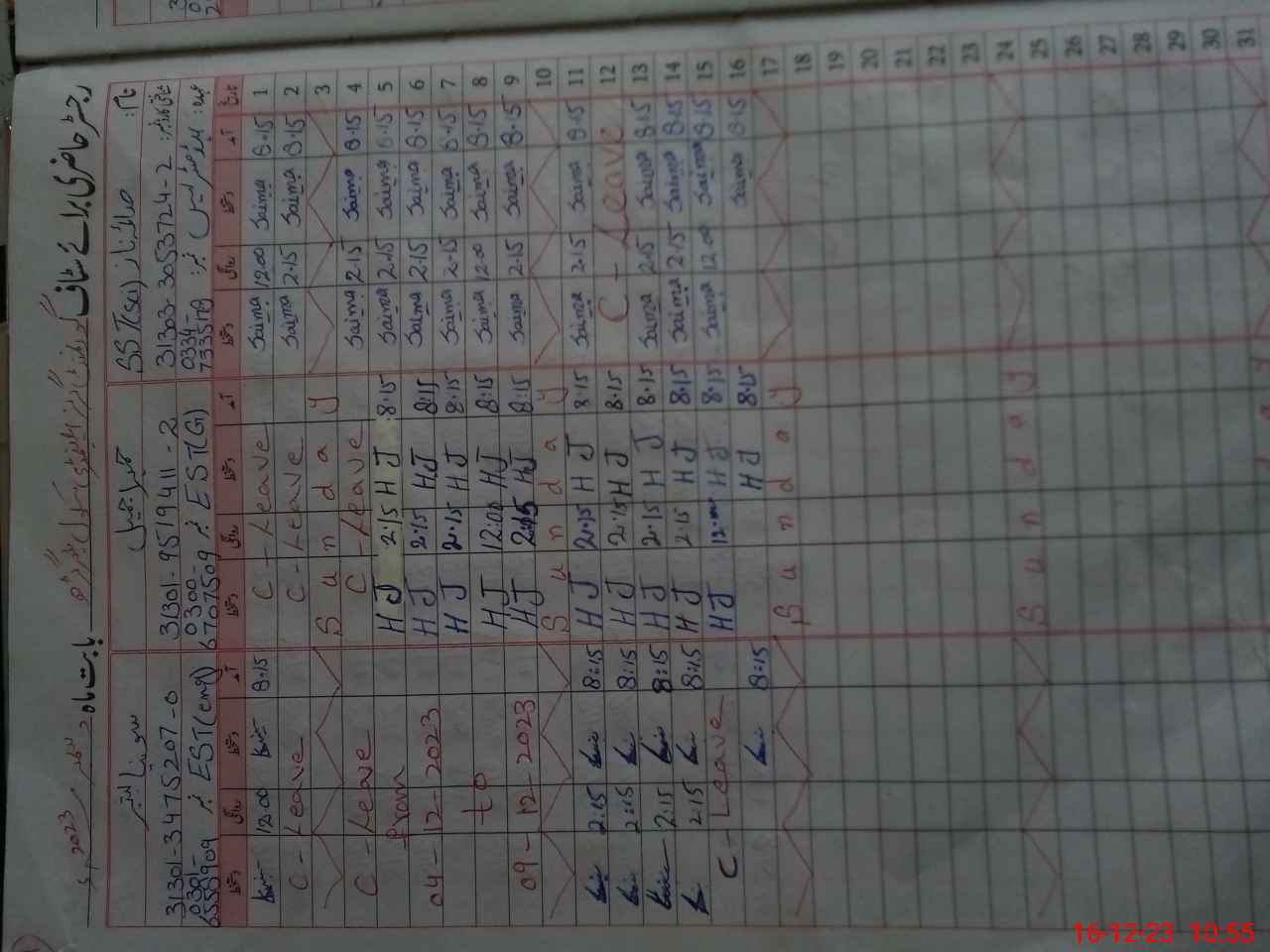 | CNIC | Full Name | Designation | R/C | Absence During Last Calender Month |
