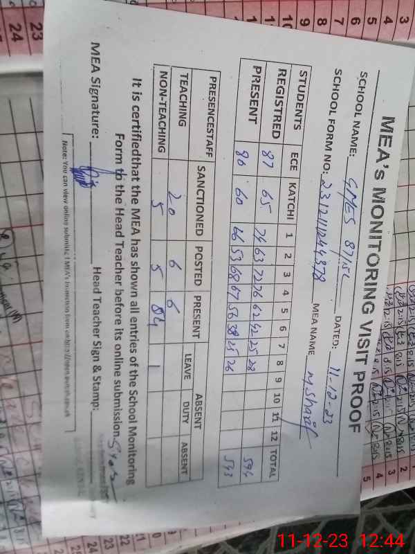 | Attendance Register | Head Teacher | MEA with School | Visit Proof |
