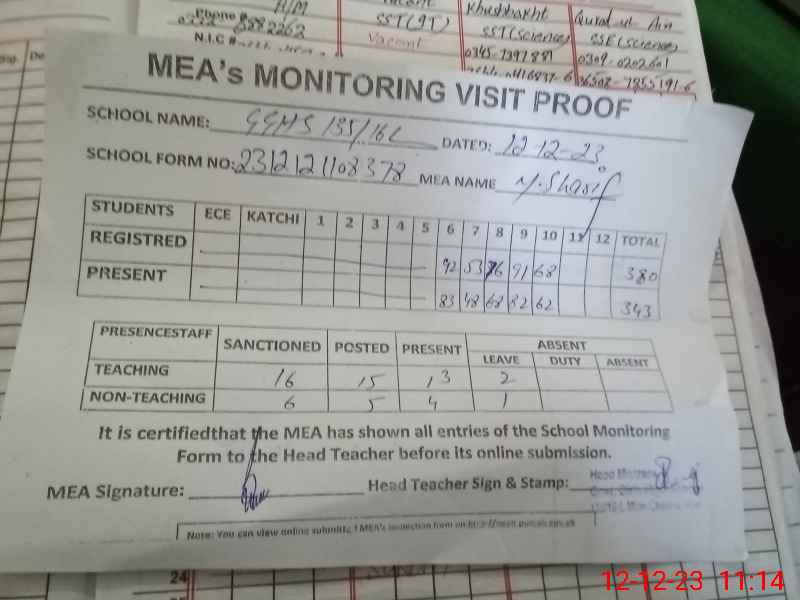| Attendance Register | Head Teacher | MEA with School | Visit Proof |