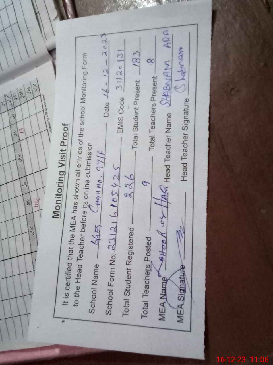 | Attendance Register | Head Teacher | MEA with School | Visit Proof |