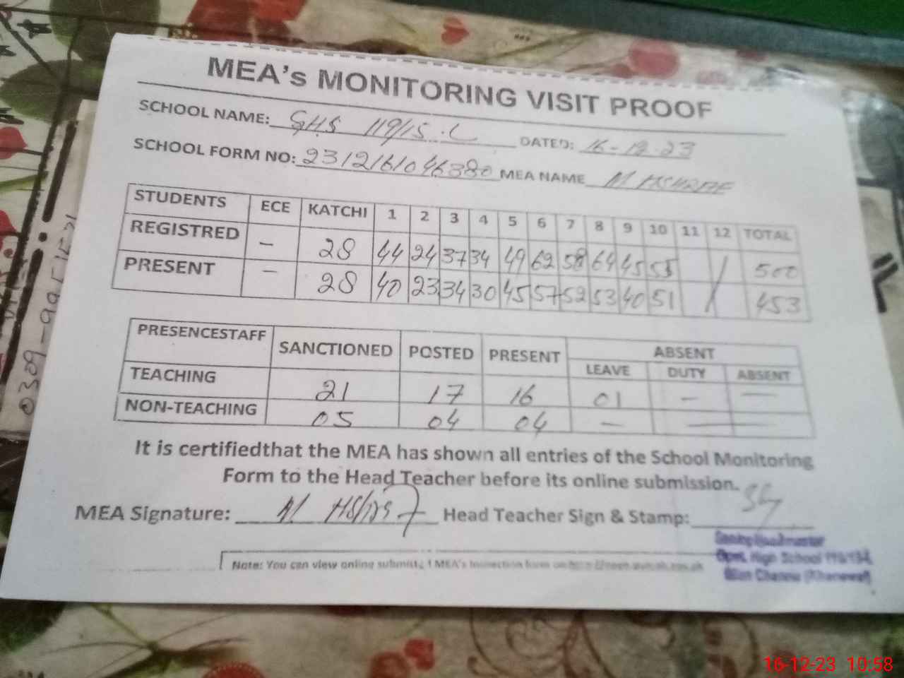 | Attendance Register | Head Teacher | MEA with School | Visit Proof |