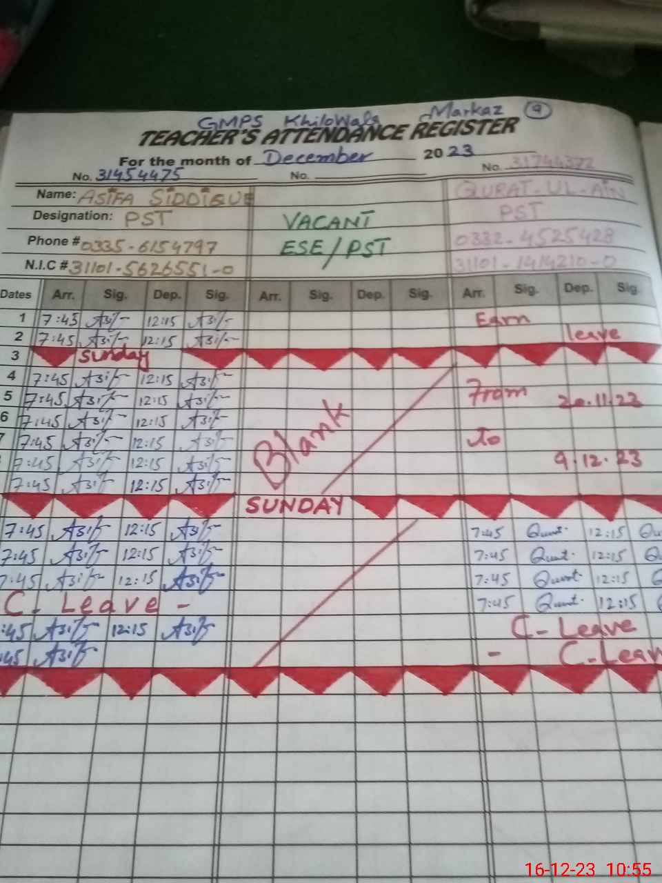 | Name: AS**** SI**** Designation: (School Headmaster's/Headmistress's) PST Phone/Cell Number: 03**** |