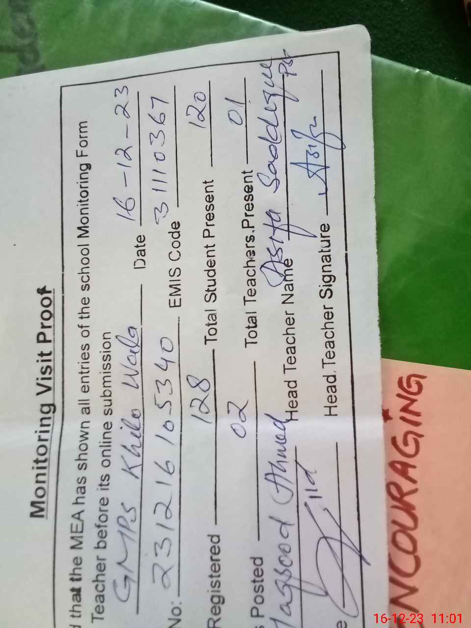 | Attendance Register | Head Teacher | MEA with School | Visit Proof |