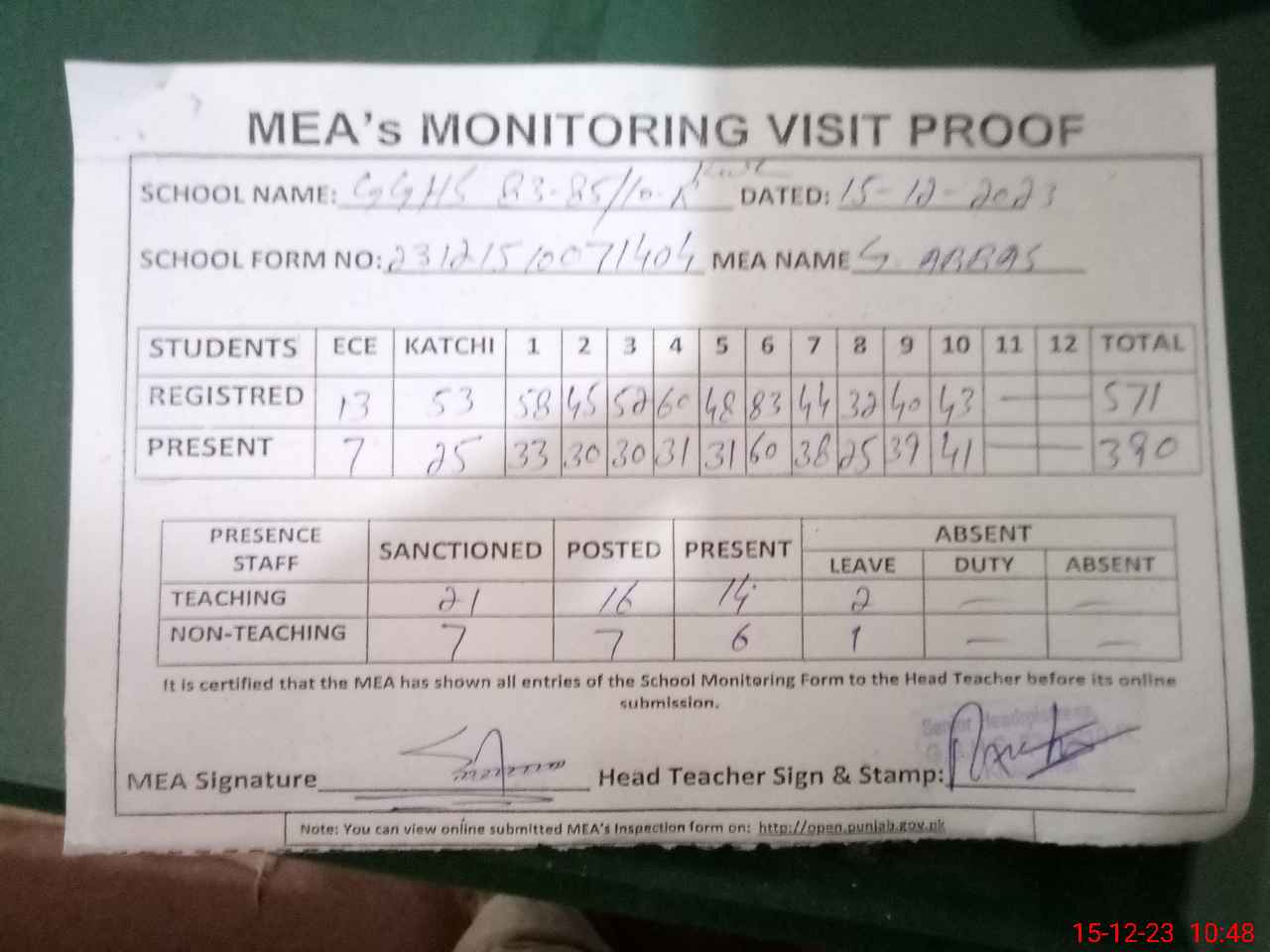 | EMIS Code: 36420100 | Name of School: GGHS 83-85/10-R, KHANEWAL | |||