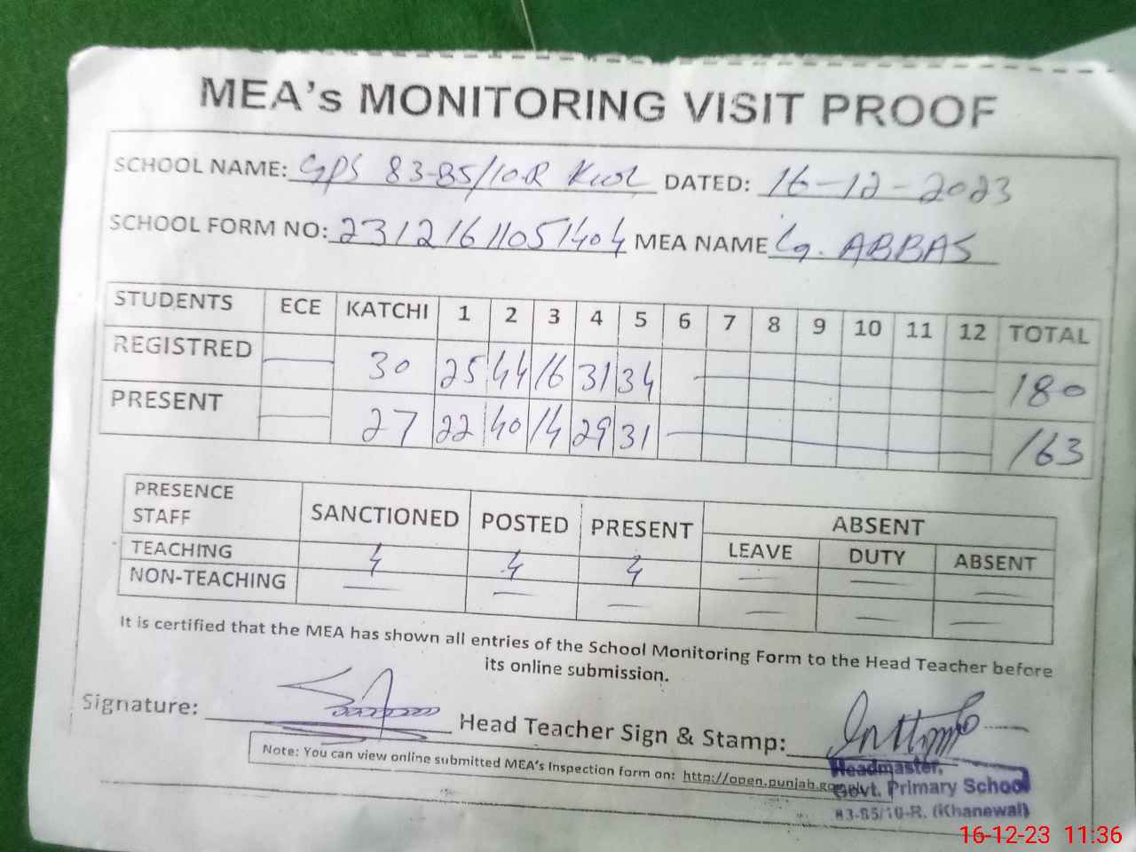 | EMIS Code: 36420170 | Name of School: GPS 83-85/10-R, KHANEWAL | |||