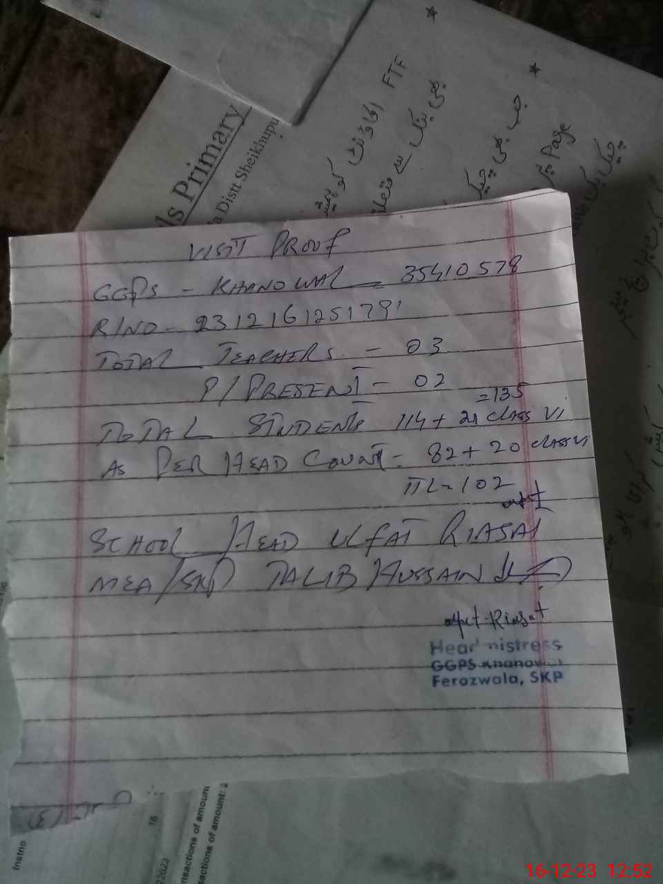 | Name: UL**** RI**** Designation: (School Headmaster's/Headmistress's) PST Phone/Cell Number: 03**** |