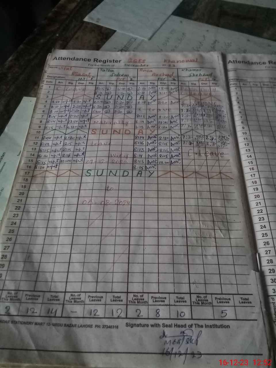 | CNIC | Full Name | Designation | R/C | Absence During Last Calender Month |