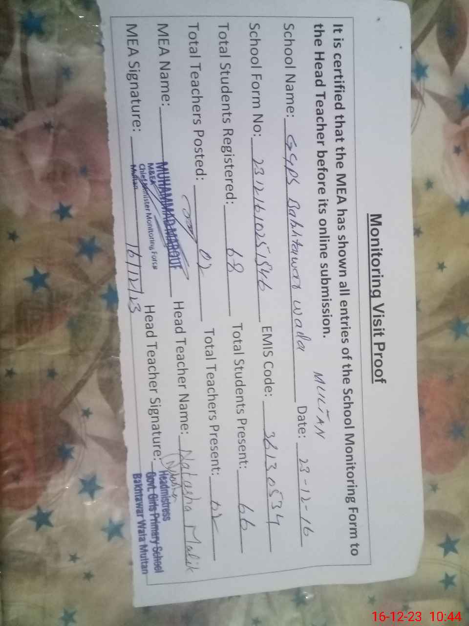 | EMIS Code: 36130534 | Name of School: GGPS BAKHTAWER WALA | |||