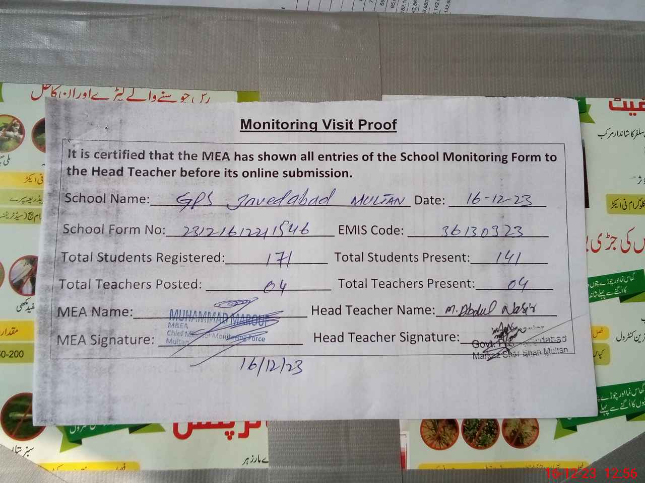 | Attendance Register | Head Teacher | MEA with School | Visit Proof |