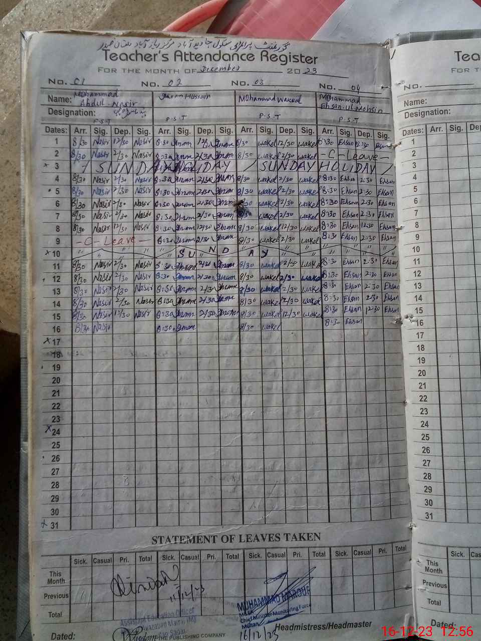 | CNIC | Full Name | Designation | R/C | Absence During Last Calender Month |