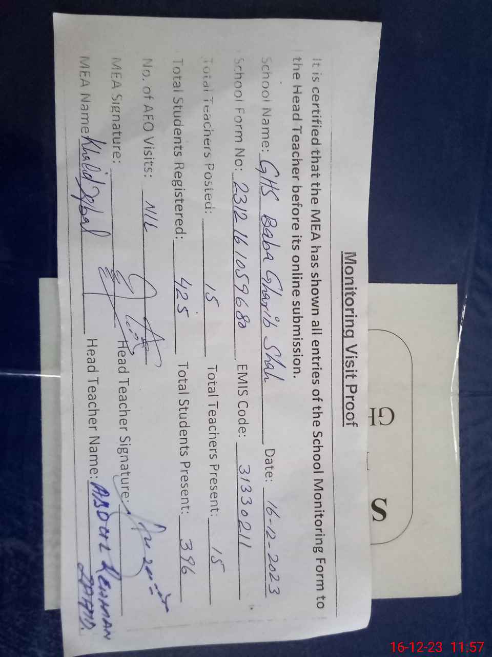 | EMIS Code: 31330211 | Name of School: GHS BABA GHARIB SHAH | |||