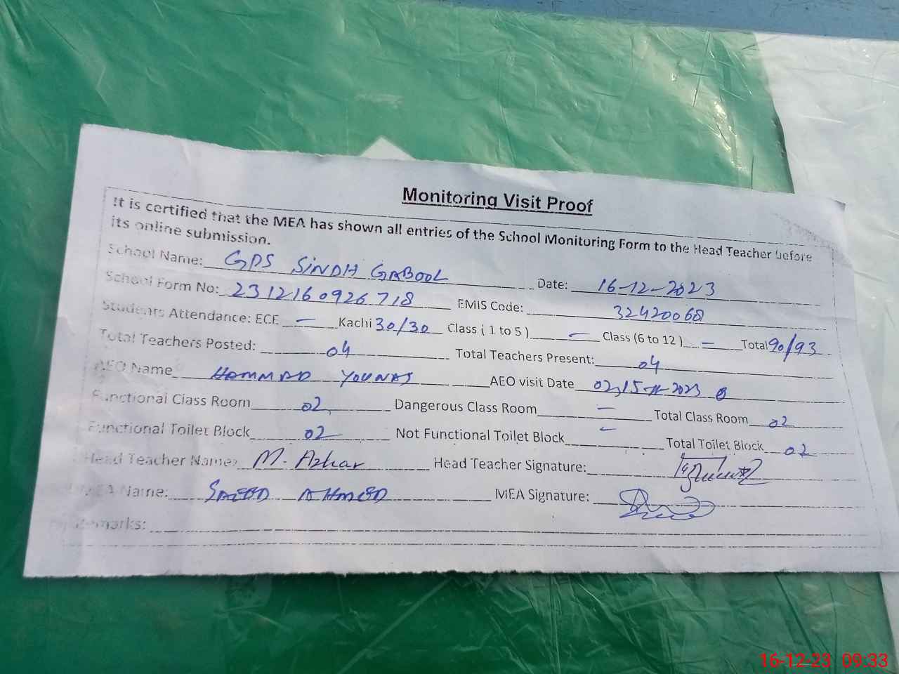| Monitoring Date: 16-12-2023 | Start Time: 16-12-2023 09:15 AM | End Time: 16-12-2023 09:44 AM | Name of MEA: Sa**** Ah**** | |