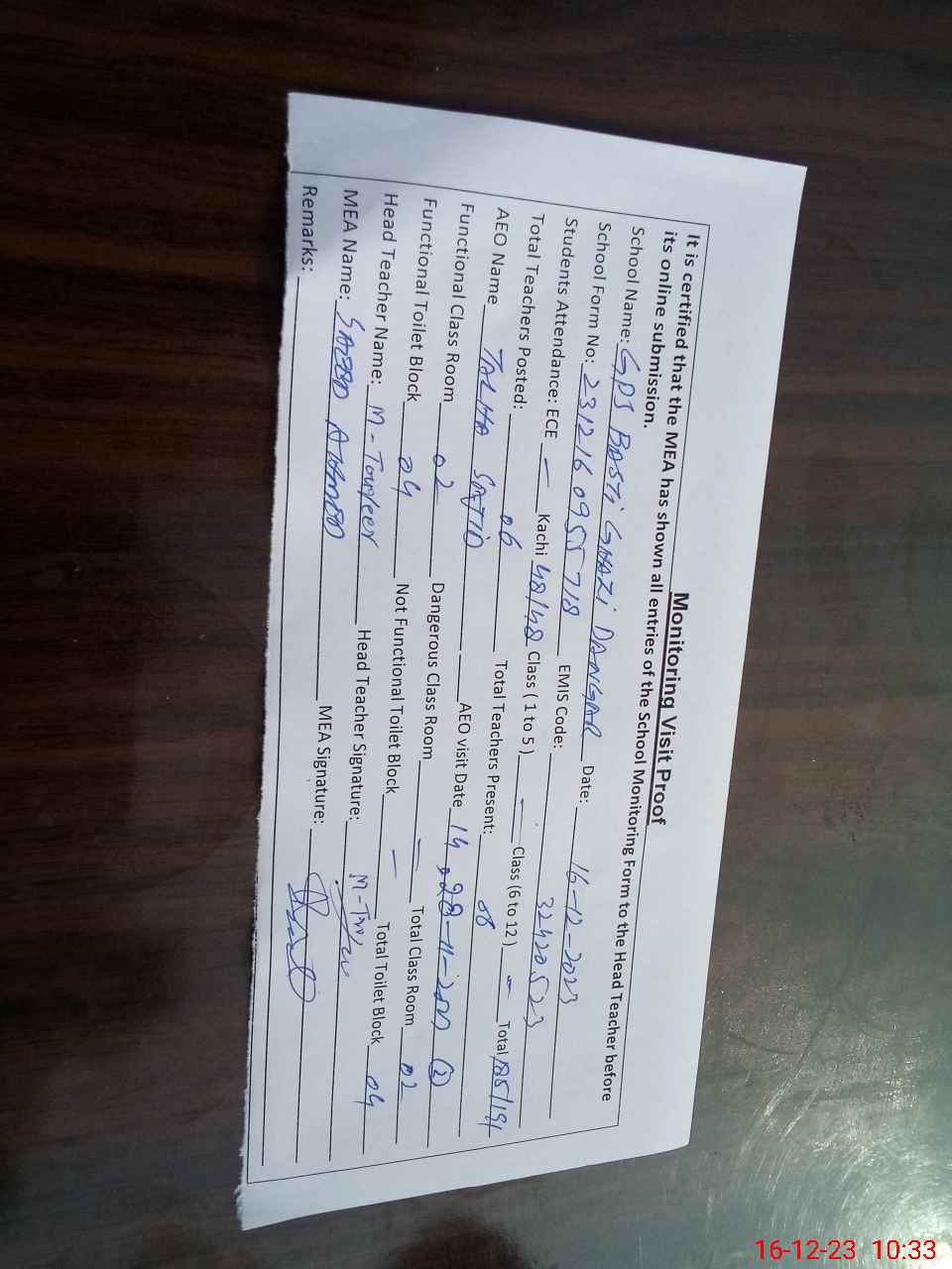 | Attendance Register | Head Teacher | MEA with School | Visit Proof |