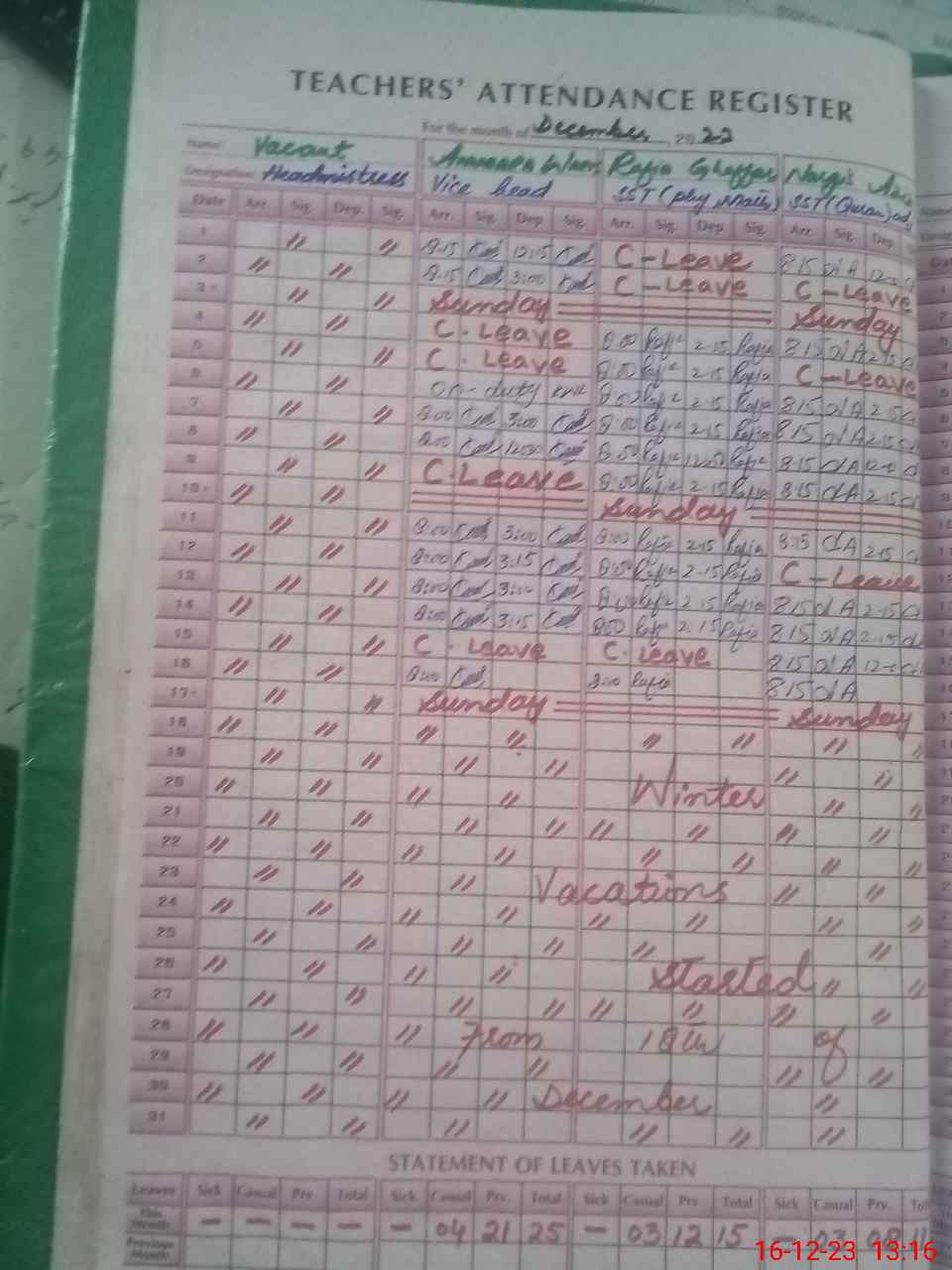 | Leave | Duty | Absent | Maternity | Medical | Ex- Pak |