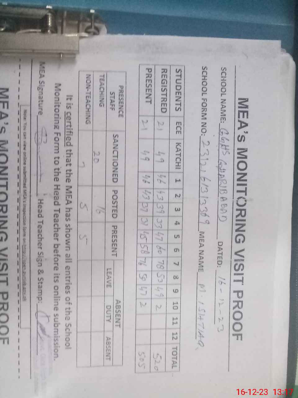 | Attendance Register | Head Teacher | MEA with School | Visit Proof |