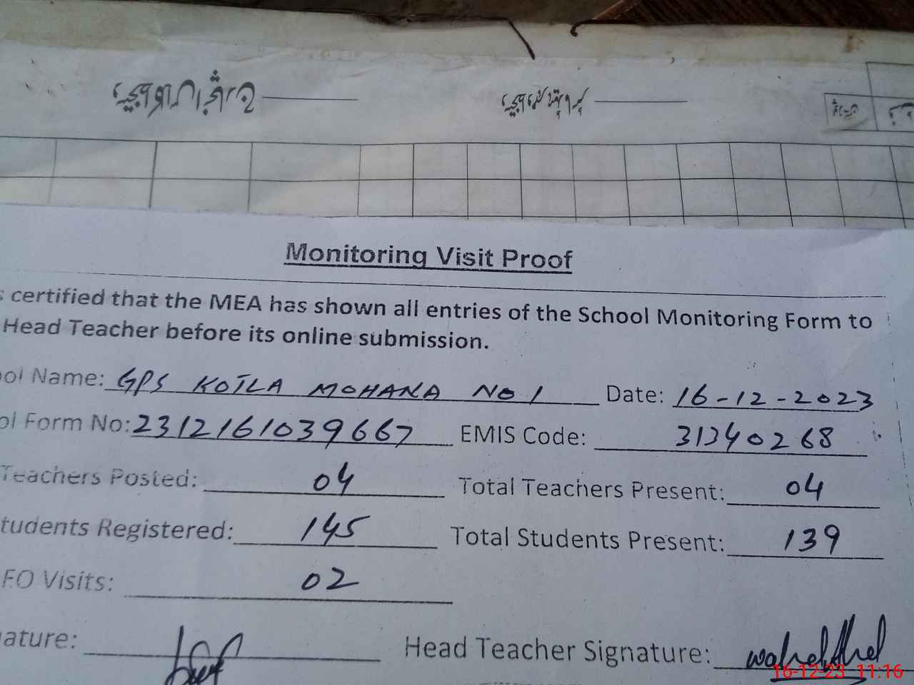 | Attendance Register | Head Teacher | MEA with School | Visit Proof |