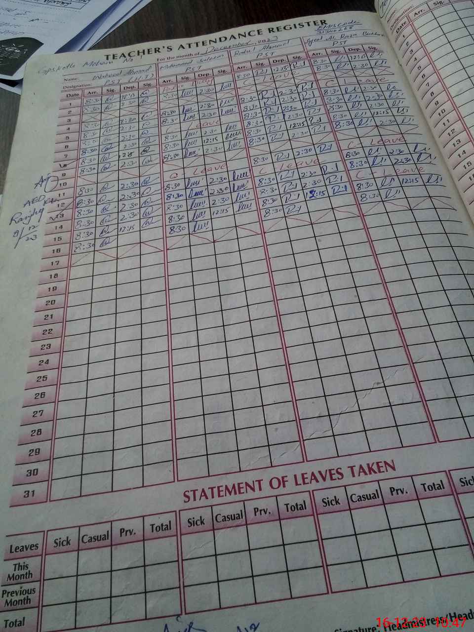 | CNIC | Full Name | Designation | R/C | Absence During Last Calender Month |