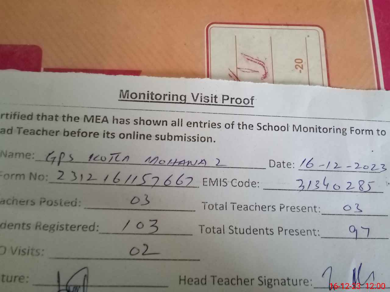 | Attendance Register | Head Teacher | MEA with School | Visit Proof |