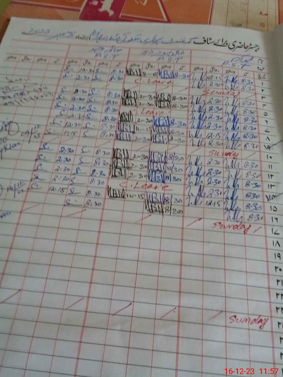 | CNIC | Full Name | Designation | R/C | Absence During Last Calender Month |